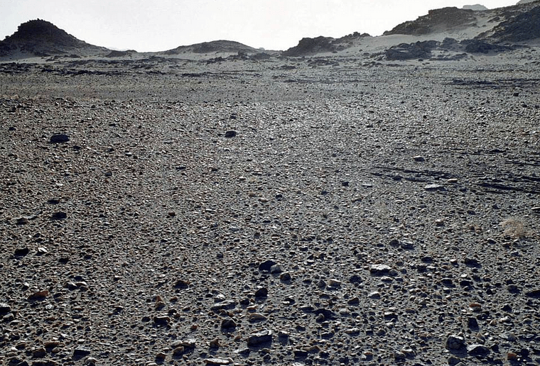 Soon the rough track ended, and we were driving across a gravel plain following a couple of sets of tire tracks. The tracks were made by overloaded ten ton trucks, and were far too deep for us to drive in. But we drove easily alongside the truck tracks, sometimes making our own ruts and sometimes staying up on the hard surface. This is the desert pavement (known as reg) that covers much of the Sahara. Jacques continued to drive at a great speed, occasionally crashing into small hollows he hadn’t time to brake for. As we drove, suddenly the ground would be harder, and there were no tracks to follow. As we were driving so fast, we were instantly in a trackless wilderness. We would drive until we came out of the hardpan, then swing right and left looking for the truck tracks. Sometimes we found them quickly, sometimes they were not to be seen. As the desert was flat and featureless, and we were speeding across it and sweeping from side to side, when we got lost it was very hard to know which side of the tracks we were on. We might easily have strayed a mile or more off track.